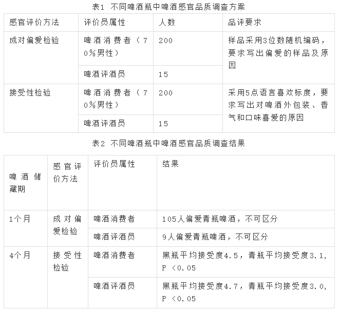 試驗設計:以10°純啤酒為樣品,分別采用相同容量的黑瓶與青瓶包裝,常溫條件下貯藏1個月和4個月后分別進行感官調查研究。檢驗方法選用成對檢驗法、消費者接受性檢驗法,風險水平α=0.05。
