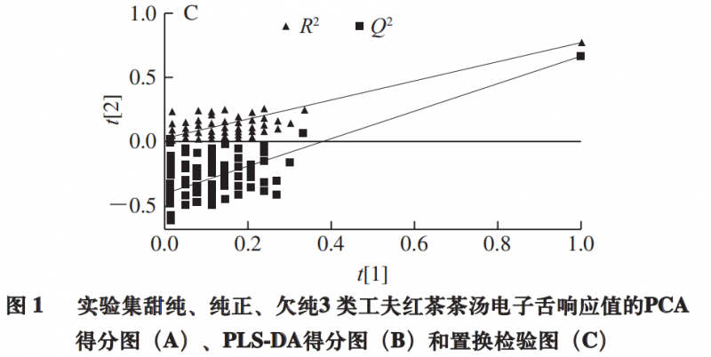 為探索電子舌檢測(cè)能否用于工夫紅茶茶湯滋味的判別,以電子舌7 個(gè)傳感器響應(yīng)值為X變量,以茶湯滋味分組(甜純、純正、欠純)為Y變量做PLS-DA。PLS-DA是一種有監(jiān)督的模式識(shí)別方法,相對(duì)于PCA所得的投影通??色@得更好的分類效果。如圖1B所示,3 類(甜純、純正、純)茶湯的聚類結(jié)果類似于PCA的結(jié)果(R2x =1,R2Y =0.61,Q2 =0.512)。Q2 大于0.5,表明模型具有較好的預(yù)測(cè)能力。過(guò)擬合是PLS-DA模型的一個(gè)常見(jiàn)問(wèn)題。為進(jìn)一步驗(yàn)證PLS-DA模型的可靠性,對(duì)該模型進(jìn)行置換檢驗(yàn)驗(yàn)證(圖1C)。將模型建立時(shí)定義的Y矩陣的變量隨機(jī)排列100 次,得到R2和Q2 截距分別為(0.0,0.029)和(0.0,-0.399),表明PLS-DA模型穩(wěn)定可靠,未存在過(guò)擬合,可用于不同滋味的判別。