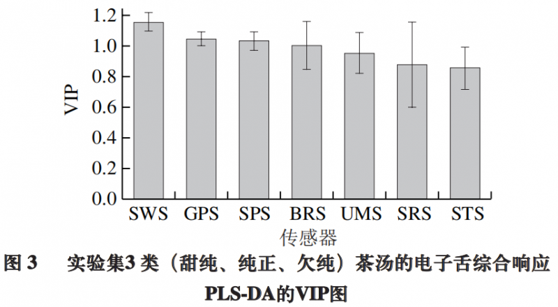 為進(jìn)一步探明電子舌7 根傳感器的響應(yīng)值對(duì)滋味分組的貢獻(xiàn),篩選出影響甜純滋味識(shí)別的關(guān)鍵傳感器,將上述PLS-DA模型做載荷分析。如圖2所示,對(duì)甜純滋味識(shí)別影響較大的變量可能為SWS(甜)、UMS(鮮)、SPS(綜合),其w×c值分別為0.47、0.42、0.42,以變量SWS(甜)貢獻(xiàn)為最大。進(jìn)一步采用變量投影重要性(variable important for the projection,VIP)篩選關(guān)鍵差異變量,如圖3所示。結(jié)果表明,VIP值大于1.0的變量包括SWS(甜)、GPS和SPS(復(fù)合味覺(jué))及BRS(苦),其中以SWS(甜)的VIP值為最高。SWS甜味傳感器對(duì)甜純組茶湯的響應(yīng)顯著高于純正組和欠純組(P<0.001),而對(duì)于純正組和欠純組的響應(yīng)差異則不顯著(圖4)。上述結(jié)果表明SWS甜味傳感器可能是識(shí)別甜純滋味的關(guān)鍵因子。