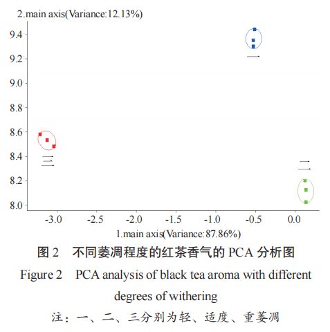 對不同萎凋程度的紅茶進(jìn)行 PCA 分析(圖 2),得出第一主成分的貢獻(xiàn)率 87.860%,第二主成分貢獻(xiàn)率為 12.134%,總貢獻(xiàn)率為99.994%。主成分分析(PCA)就是對多指標(biāo)的高維數(shù)據(jù)進(jìn)行降維,提取數(shù)據(jù)中反應(yīng)最大的幾個(gè)特征值對應(yīng)的特征向量作為主成份,貢獻(xiàn)率越大, 說明該主成分在數(shù)據(jù)信息中越重要,越能最大限度地反映樣本最原始的信息。由圖 2 可知,不同萎凋程度的紅茶香氣成分在類別和含量上有了較大的變化,其中重萎凋在第一、第二主成分上明顯區(qū)別于輕萎凋和適度萎凋,表明重萎凋的工藝使紅茶香氣成分在類別和含量上發(fā)生了較為明顯的變化;輕萎凋和適度萎凋在第一主成分上差異不明顯。整體來說,萎凋程度不同,使紅茶香氣的成分表現(xiàn)出明顯的差異。可知區(qū)分度值越趨近于 1,表明兩種物質(zhì)差異越明顯。表4中區(qū)分值都在99%以上,表明 PCA 可以將不同萎凋程度的紅茶區(qū)分開。
